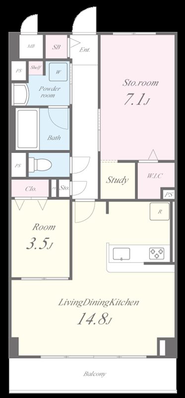 LDK(14.8畳) 洋室(3.5畳) 納戸(7.1畳)